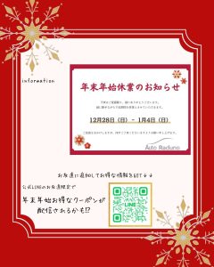 さて、年末年始に向けての計画をお考えの方も多いと思いますが、当店の年末年始の休業日のお知らせを再度ご案内させていただきます。 また、公式LINEのお友達追加へのご案内いたします📱✨!