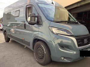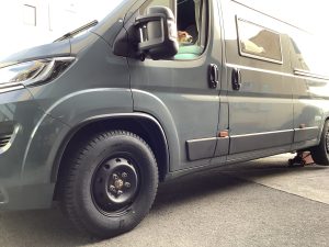 🚗✨キャンピングカーのタイヤ脱着作業を行いました。 リフトで車を上げることが難しいため、一ヶ所ずつ取り外して、新しいタイヤとホイールへの交換をしていきました。💪🔧